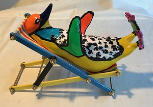 2025Pinguin van klei, acryl en epoxy. Miniatuur ligstoel van hout, koperen boutjes en gestreepte stof.